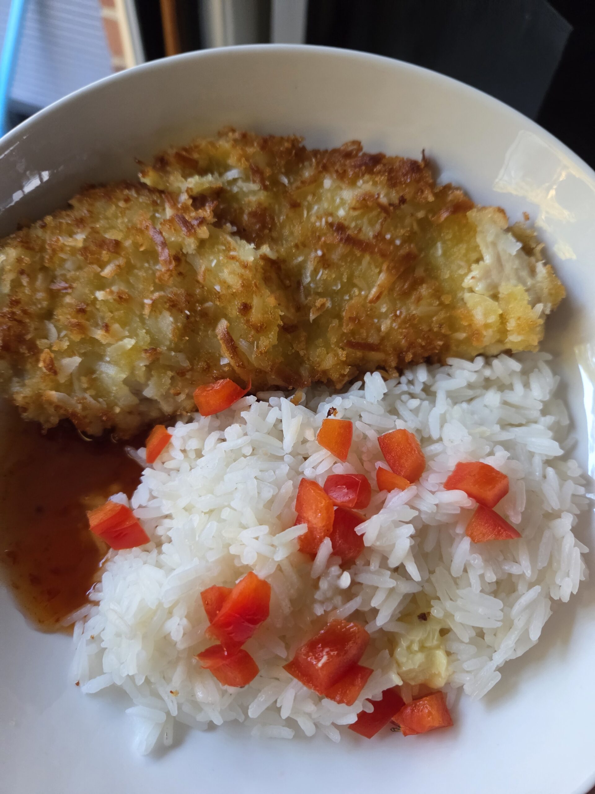 Coconut crusted chicken, pan seared to a delightful sweet crisp. Served over Jasmine rice with mixed sweet peppers and red onion. Sweet chili sauce on the side.