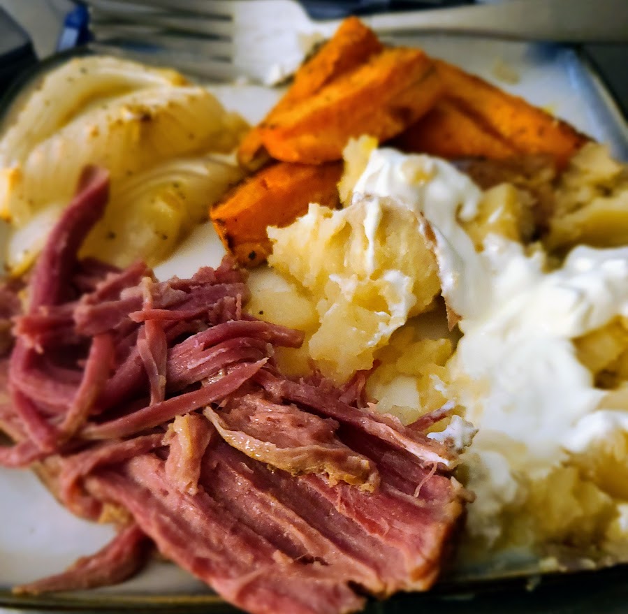 Traditional corned beef dinner with roasted carrots, cabbage, potatoes, onions and of course corned beef!