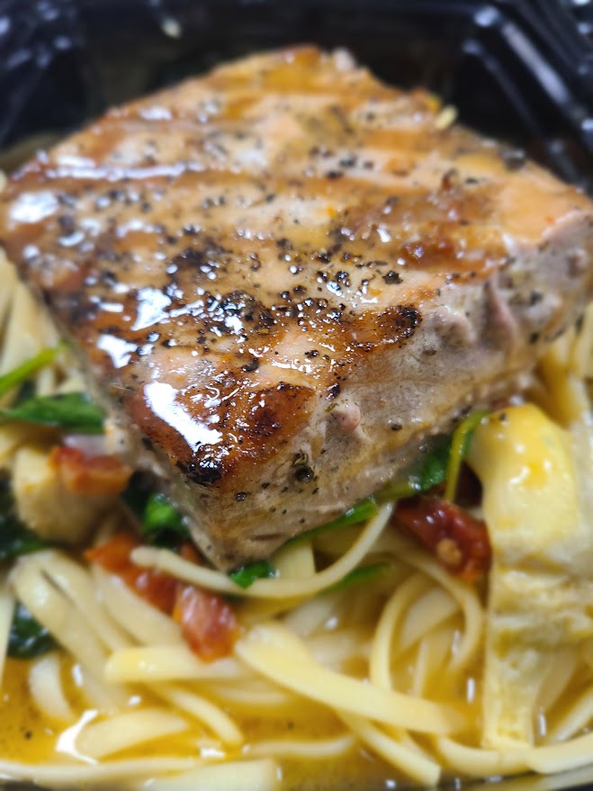 Grilled tuna steaks smothered in a white wine, lemon sauce with spinach, sundried tomatoes, and artichoke hearts. Served over pasta