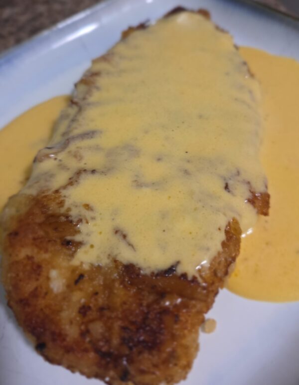 Boneless chicken breast coated in a crushed pretzel breading. Topped with tangy cheddar sauce with a hint of mustard. Served over broccoli and bow tie pasta.