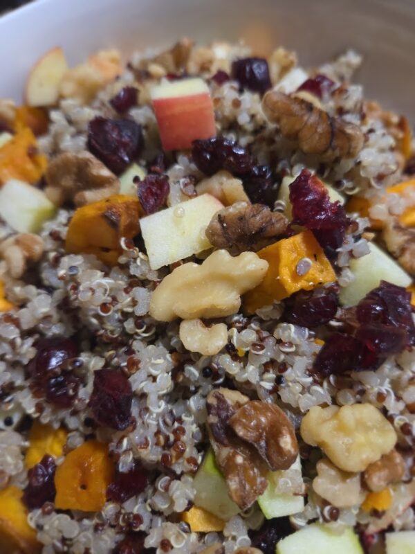 Quinoa, walnuts, dried cranberries, green and red apples, and roasted sweet potatoes in a maple balsamic dressing.