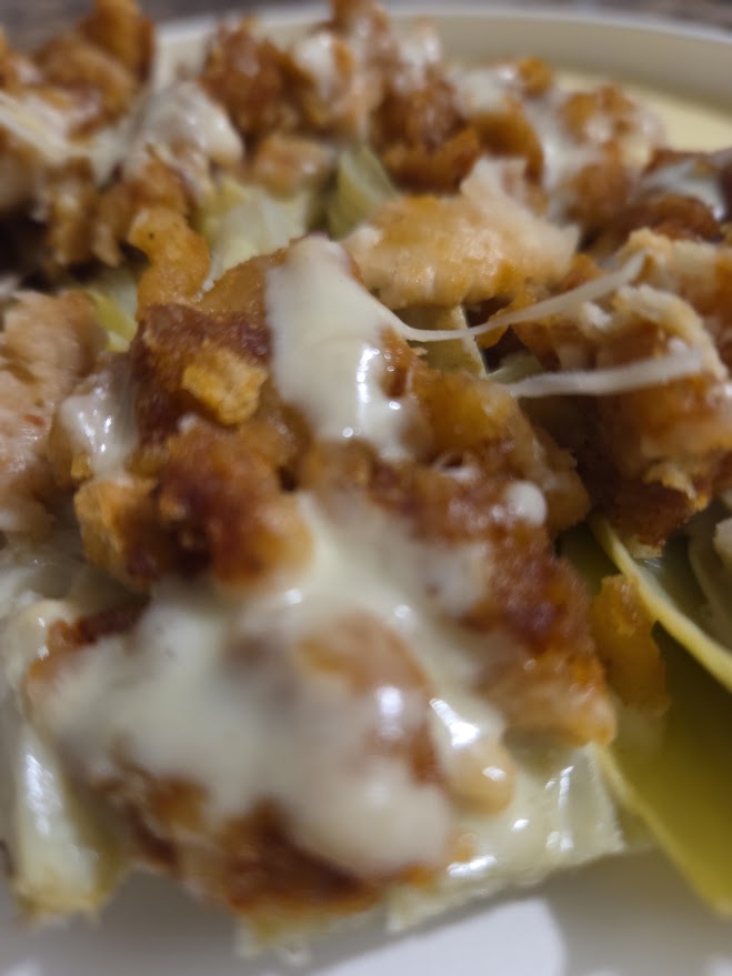 Quartered artichoke hearts, ritz cracker stuffing, onion, garlic, chorizo and mornay sauce on the side.